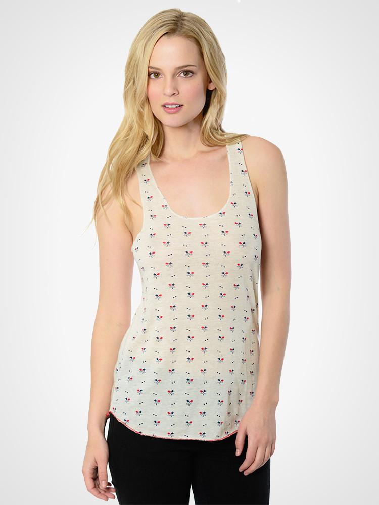 Ultra soft and unique flower, American Ditsy, printed racer back tank. This lightweight racer tank is made of an ultra soft eco-jersey tri-blend and features a rolled hem and rounded bottom.
