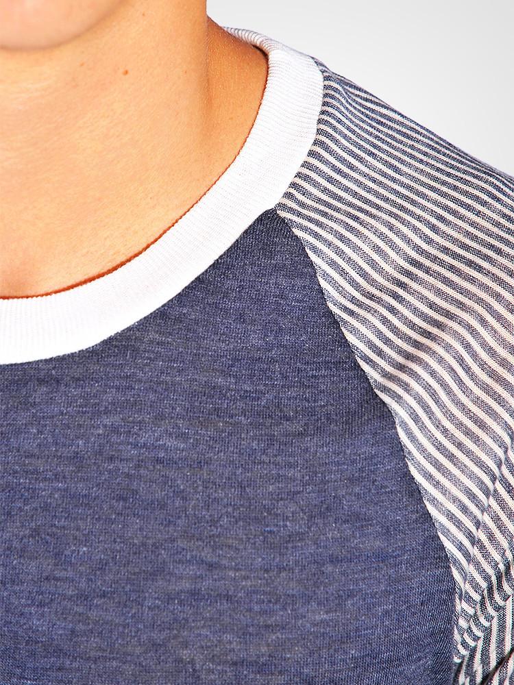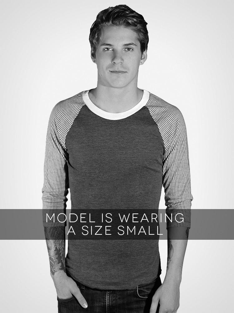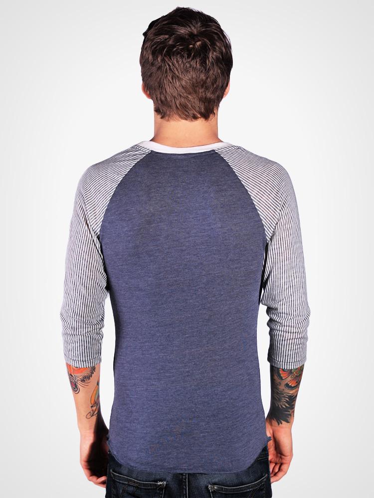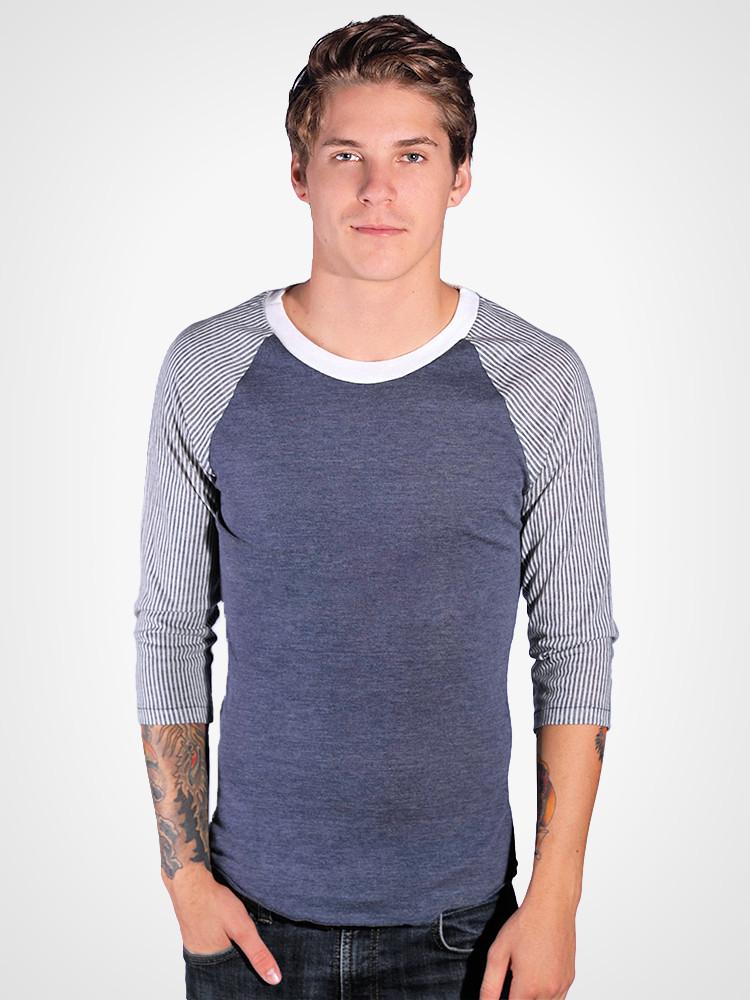 made of alternative's incredibly soft and comfortable eco jersey, comes the Railroad print 3/4 sleeve baseball tee. featuring a Navy body, Striped print sleeves, and a contrasting white neckline.